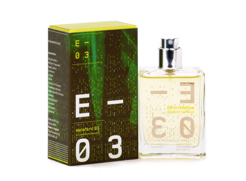 Escentric 03 в основном состоит из химического аромата Vetiveryle Acetate, синтетической молекулы, извлеченной из Ветивера, характеризующейся сладкими, свежими и сухими древесными оттенками. Он также содержит ингредиенты, усиливающие его древесность.