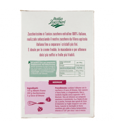 Zuccherissimo - единственный 100% итальянский сверхтонкий сахар, который производится путем просеивания нашего сахара из итальянской сельскохозяйственной цепочки поставок до отделения мельчайших кристаллов. Он идеально подходит для холодных кремов, фруктовых салатов, а также для получения более мягких сладостей и более рассыпчатого песочного теста. Сахар - это основной компонент питания, потому что он обеспечивает организм необходимой энергией. Italia Zuccheri рекомендует потреблять их ответственно, напрямую и через другие продукты.