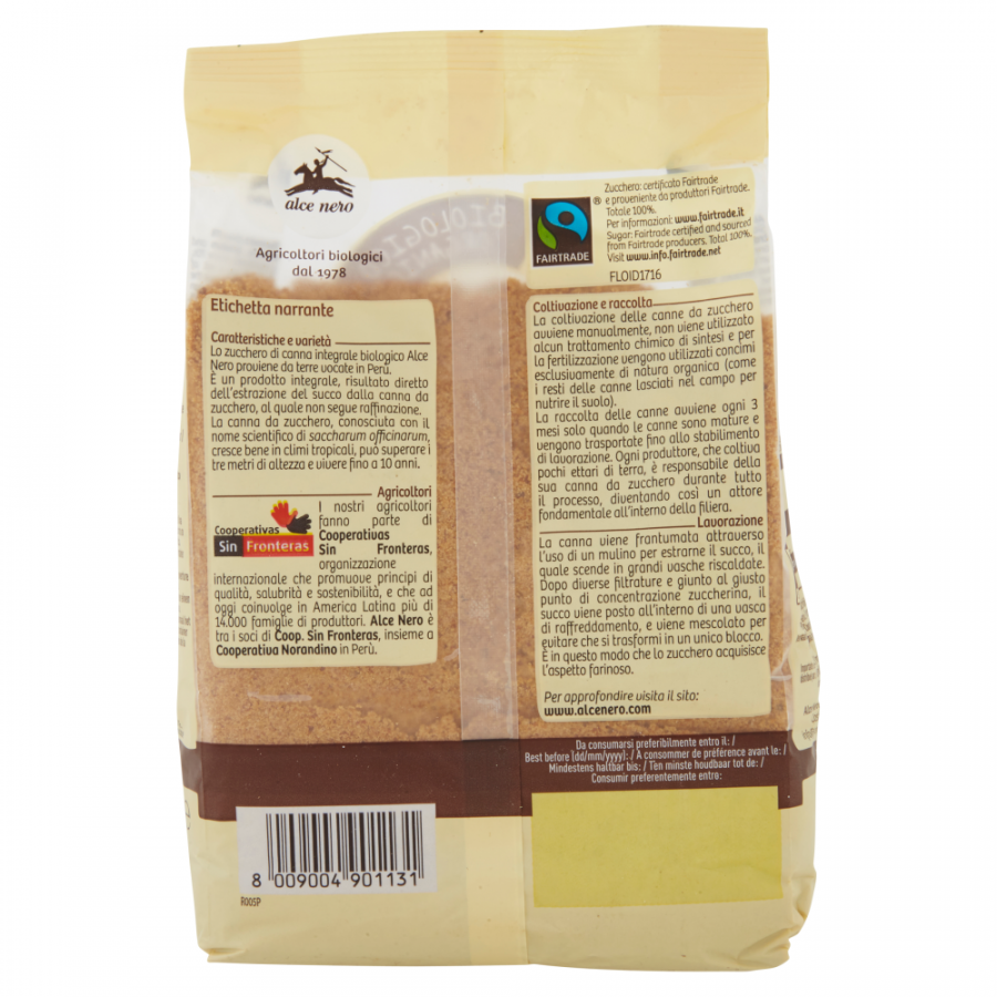 Органический цельный тростниковый сахар Alce Nero поступает из подходящих земель в Перу. Это цельнозерновой продукт, являющийся прямым результатом отжима сока из нерафинированного сахарного тростника. Сахарный тростник, известный под научным названием saccharum officinarum, хорошо растет в тропическом климате, может превышать три метра в высоту и жить до 10 лет. Фермеры - Cooperativas Sin Fronteras являются частью Cooperativas Sin Fronteras, международной организации, которая продвигает принципы качества, здоровья и устойчивости и в которую сегодня входят более 14 000 семей производителей в Латинской Америке. Выращивание сахарного тростника осуществляется вручную, без использования синтетической химической обработки и для удобрения используются исключительно органические удобрения (например, остатки тростника, оставленные в поле для питания почвы). Сбор тростника производится каждые 3 месяца только после того, как он созреет, и его отправляют на перерабатывающий завод. Каждый производитель, который обрабатывает несколько гектаров земли, несет ответственность за свой сахарный тростник на протяжении всего процесса, становясь, таким образом, ключевым игроком в цепочке поставок. Сырье измельчается с помощью мельницы для извлечения сока, который опускается в большие подогреваемые резервуары. После нескольких фильтрований и достижения нужной точки концентрации сахара сок помещается в охлаждающий резервуар и перемешивается, чтобы предотвратить его превращение в единый блок. Так сахар приобретает мучнистый вид.