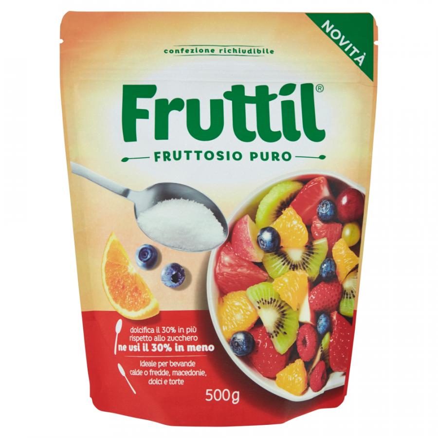 Фруктоза - это сахар, которым особенно богаты спелые фрукты и мед. Ее нежный аромат усиливает и обогащает вкус и аромат продуктов, в которые она добавлена. Идеально подходит для горячих или холодных напитков, таких как кофе, чай, молоко и настои, сладости и пирожные, салаты из свежих фруктов. Fruttil обладает большей подслащивающей способностью, чем сахар: фактически, при том же весе он подслащивает на 30% больше. Это позволяет использовать меньшие количества для того же подслащивания. 1 чайная ложка 4 г фруттила = 16 ккал (68 кДж). Фруттил получают с помощью специального производственного процесса, тщательно контролируемого на каждой фазе, что гарантирует высокий уровень качества и чистоты.