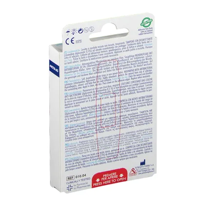 Центральная прокладка: закругленные углы для улучшения прилегания к ране. Марлевые тампоны из нетканого материала с микроперфорированной антипригарной пленкой. Марля содержит 0,5% диглюконата хлоргексидина, обладающего антибактериальным действием.