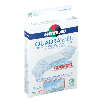 Quadra Med® - это пластырь из нетканого материала, снабженный впитывающей подушечкой с дезинфицирующим веществом (хлоргексидина диглюконат 0,5%). Гипоаллергенный клей, не содержащий растворителей и натурального латекса. Он имеет эксклюзивную запатентованную эргономичную форму.