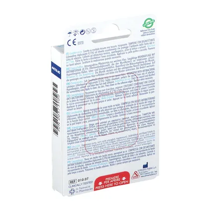 Центральная прокладка: закругленные углы для улучшения прилегания к ране. Марлевые тампоны из нетканого материала с микроперфорированной антипригарной пленкой. Марля содержит 0,5% диглюконата хлоргексидина, обладающего антибактериальным действием.