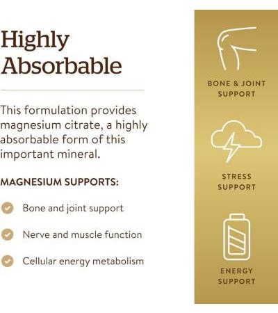 Для того, чтобы производить наиболее эффективную продукцию, компания Solgar использует цитратную форму магния, которая хорошо усваивается.